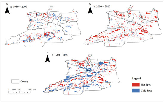 The results indicate that the distribution of hot spots of EEQ changes on the NSTM is stable. There are stronger aggregation effects during the 2000–2020 period compared to 1980–2000. The distribution of hot spots dominated the entire study period (1980–2020). However, the aggregation effect of cold spots of EEQ changes on the NSTM has gradually weakened from the 1980–2000 period to the 2000–2020 period. Nevertheless, over the entire study period (1980–2020), there are noticeable aggregation characteristics.