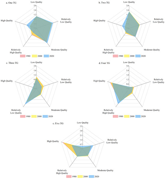 - Different levels of EEQ areas exhibit significant gradient differences. In the One and Two Gradient Levels, low-quality, relatively low-quality, and moderate-quality areas are predominantly distributed. Conversely, on the Three to Five Gradient Levels, EEQ is better, and, as the Terrain Gradient level increases, regions exhibiting predominant distribution tend to have higher EEQ. From 1980 to 2020, there was a slight improvement in EEQ on the One and Two Terrain Gradient levels, significant improvement on the Three Terrain Gradient level, slight deterioration on the Four Terrain Gradient level, but predominant distribution still consisted of high-quality and relatively high-quality areas. On the Five Terrain Gradient level, EEQ declined, with a significant reduction in the area of high-quality areas.