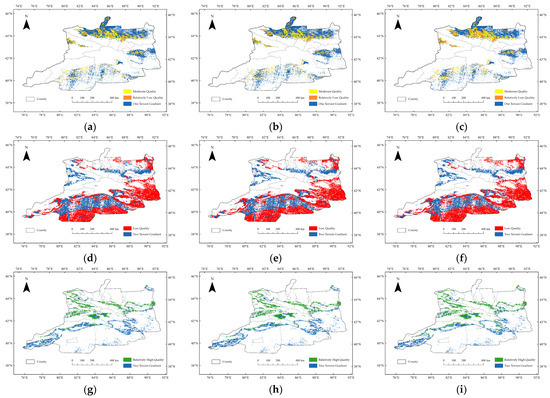 The relationship between the EEQ and Terrain Gradient is shown in Figure 11. At the One Terrain Gradient level, low-quality and medium-quality areas are dominantly distributed. This gradient level is mainly distributed in the northern part of the NSTM, an area characterized by fertile land, sufficient water sources, and convenient transportation. These factors provide excellent conditions for agricultural and pastoral production and residence, making it a primary area for Production Space and Living Space. At the Two Terrain Gradient level, low-quality areas are dominantly distributed. This gradient level is widely found in the southern part of the NSTM. As the Terrain Position Index increases, this region become less suitable for habitation and production activities. Moreover, the desert grasslands and Gobi areas are mostly distributed at this terrain gradient level. At the Three Terrain Gradient level, relatively high-quality areas are dominantly distributed. This gradient level is found along the foothills of the Tianshan Mountains, an area rich in grassland resources, including the Bayanbulak Grassland, Kunnes Grassland, Barkol Grassland, and vast mountain grasslands. A large amount of pasture ecological land is distributed here. At the Four Terrain Gradient level, both relatively high-quality and high-quality areas are dominantly distributed. This gradient level is mainly distributed on the mid-slopes of the Tianshan Mountains, an area abundant in forest resources. The coniferous forest is widely distributed here, and there are many artificial forests near settlements, primarily consisting of farmland shelterbelts and orchard. The Five Terrain Gradient is distributed at the mountain tops of the Tianshan Mountains. At this gradient level, high-quality areas are dominantly distributed with the highest degree of dominance. Additionally, relatively high-quality, moderate-quality, and relatively low-quality areas are also dominantly distributed here. This area lies above the snow line, where numerous glaciers are found, providing abundant glacier water storage. Moreover, the Tianshan glaciers serve as the source of many rivers in Xinjiang, providing a stable supply of water, thereby contributing to the good EEQ. However, this gradient level also includes the high-altitude ice and snow gravel desert landscape, characterized by bare rocks with no vegetation cover.