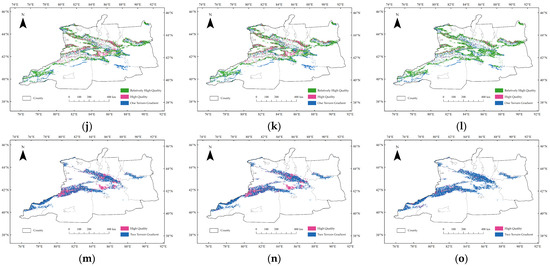 Spatial distribution of Terrain Gradients and regions with predominant EEQ. (a–c) Distribution of One Terrain Gradient in 1980, 2000, 2020; (d–f) distribution of Two Terrain Gradient in 1980, 2000, 2020; (g–i) distribution of Three Terrain Gradient in 1980, 2000, 2020; (j–l) distribution of Four Terrain Gradient in 1980, 2000, 2020; (m–o) distribution of Five Terrain Gradient in 1980, 2000, 2020.