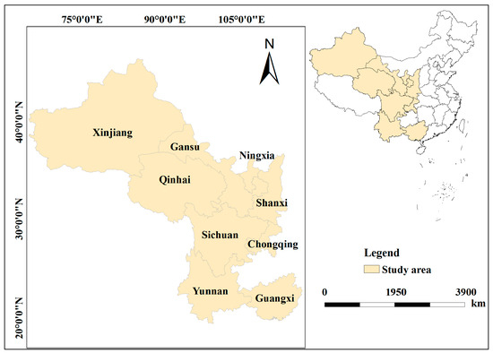 The Silk Road Economic Belt encompasses five northwestern (Xinjiang, Gansu, Qinghai, Ningxia, and Shaanxi) and four southwestern provinces (Guangxi, Chongqing, Sichuan, and Yunnan) (Figure 1), covering approximately 44% of China’s land area. This region spans various climate types, including subtropical monsoon, temperate monsoon, temperate continental, and plateau continental. It is rich in natural, cultural, and tourism resources, positioning it as China’s new frontier for opening up to the world. The provinces and cities along the belt have interconnected yet diverse locational conditions, resource endowments, infrastructure, and economic development levels. The construction of the Silk Road Economic Belt offers a historical opportunity for these regions to enhance their regional connectivity and cooperation, aiming for coordinated economic and social development.