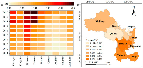 Spatiotemporal characteristics of the comprehensive level of RR. Note: the southwest four provinces (Guangxi, Chongqing, Sichuan, Yunnan) and the northwest five provinces (Shaanxi, Gansu, Qinghai, Ningxia, Xinjiang) (a) temporal changes in RR; (b) spatial variation changes in RR.