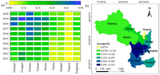 Spatially, the RR and THD levels in the southwestern provinces were generally higher than those in the northwestern provinces (Figure 2b). The average annual values of RR levels, ranked from highest to lowest, were Sichuan (0.435), Yunnan (0.369), Guangxi (0.358), Shaanxi (0.290), Chongqing (0.287), Xinjiang (0.266), Gansu (0.210), Ningxia (0.196), and Qinghai (0.184). The spatial pattern of RR is closely related to the regional natural environment, agricultural development level, and socioeconomic conditions. Regarding the THD, Sichuan exhibited the highest comprehensive development level (0.355). By contrast, the THD level in Ningxia was lower than that in the other provinces, with an annual average of only 0.074 (Figure 3b). Sichuan boasts an advanced economy, a well-developed industrial structure, and rapidly advancing infrastructure, including transportation. These factors facilitate the efficient flow and allocation of urban and rural resources, providing strong support for tourism development. In contrast, Qinghai faces challenges such as a fragile natural environment, inadequate tourism service facilities, and a shortage of specialized talent, which hinder the development of THD.