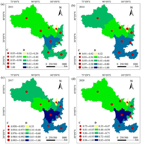 Characteristics of the coupling degree and CCD between RR and THD levels: (a) C and D in 2011; (b) C and D in 2014; (c) C and D in 2017; (d) C and D in 2020.