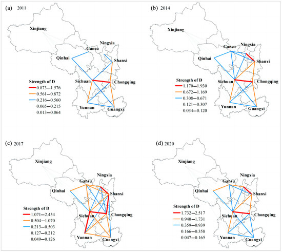 To further understand the spatial connection characteristics of RR and THD, a gravity model was employed to analyze the connection strength of the CCD between different provinces (Figure 5). As the figure shows, the spatial connection strength and network complexity of the CCD from 2011 to 2020 exhibited an initial increase, followed by a decrease. In 2011, the connection strength between Sichuan and Chongqing was higher than that between the other provinces (Figure 5a). By 2020, the spatial connection strengths between Sichuan and Chongqing and between Ningxia and Shaanxi were the highest (Figure 5d). In addition, the connection strength between Ningxia, Gansu, and Qinghai gradually increased (Figure 5d). Additionally, the degree of association between Xinjiang and the other provinces remained consistently weak across different periods, primarily due to its inland location, inconvenient transportation, and distance from major source markets.