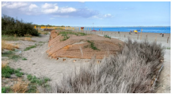 The EU Horizon 2020 OPERANDUM project carried out on-site research implementing OAL, based on the living lab concept defined by Westerlund and Leminen [33] as “physical regions or virtual realities, or interaction spaces […] for creation, prototyping, validating, and testing of new technologies, services, products, and systems in real-life contexts”. The OAL Italy was entirely located in the Emilia-Romagna region on the Panaro River (Figure 3) and the Bellocchio beaches (Figure 1). The first site tested deep-rooted plants (Figure 4) to strengthen river embankments; the second tested artificial dunes with special sandbags (Figure 2) to protect the beach and the surrounding ecosystem from storm surges and coastal erosion.