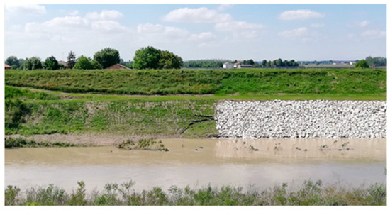 The Panaro River is a tributary of the Po River and flows for the greatest part in the province of Modena in the Emilia-Romagna region (Figure 3), with a basin covering 1775 km2, 45% of which is in a mountain environment. The main hazard here is river flooding since the area is a natural floodplain. The basin is densely populated, with numerous industrial and agricultural activities, including livestock farming, resulting in a significant level of exposure. Vulnerability is further heightened by insufficient wetland management, inadequate flood protection for properties and structures, and diminished water retention capacity. Consequently, the region faces risks such as the potential loss of human life, infrastructure damage, property loss, and harm to agricultural crops and livestock. The chosen NBS is designed to alleviate the risk of flooding caused by soil erosion along the inner edge of the riverbank by planting deep-rooted shrub vegetation (twelve species of perennial cespitose and Leguminosae graminoid grasses) (Figure 4) to reinforce the embankment.