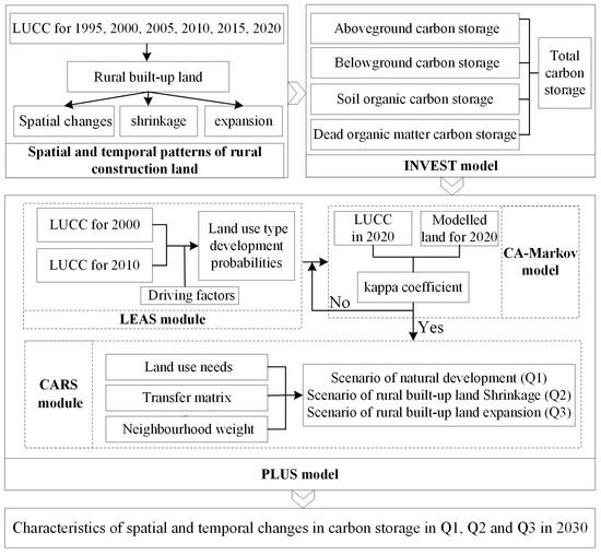 Finally, fourteen driving factors were selected. Three development scenarios—natural development (Q1), rural built-up land shrinkage (Q2), and rural built-up land expansion (Q3)—were established to simulate and predict the spatial pattern of rural built-up land and the spatial distribution of carbon storage in 2030.