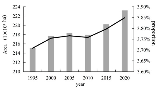 Rural built-up land area and proportion of overall land area, 1995–2020. The bar chart represents the area of rural built-up land. The line represents the proportion of rural built-up land area to the total land area.