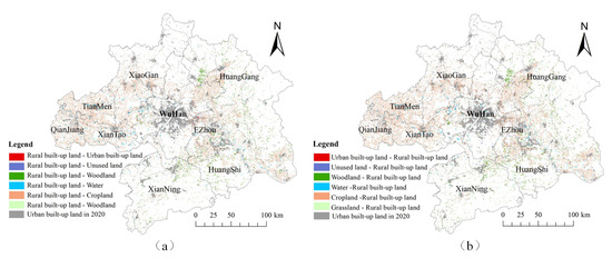 Changes in rural built-up land in the Wuhan Metropolitan Area, 1995–2020. (a) represents the spatial distribution of the shrinkage of rural built-up land; (b)represents the spatial distribution of the expansion of rural built-up land. Note: Due to the small size of the parcel changes, this map bolds the outlines of parcels where rural built-up land has changed. Consequently, the map only represents the location of land type changes, and the pixel occupancy does not reflect the actual area converted. For specific conversion areas, please refer to Table 4 and Table 5.