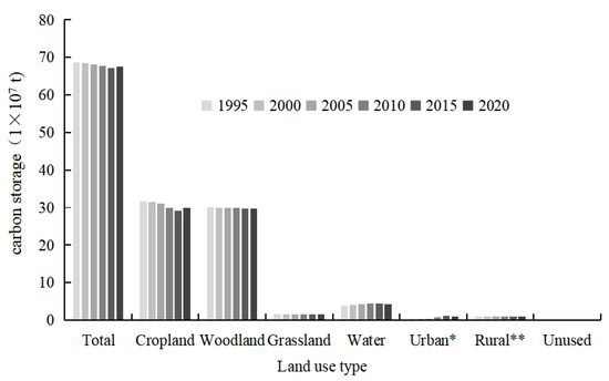 Carbon storage in seven land use types in Wuhan urban area, 1995–2020. Note: * is urban built-up land, ** is rural built-up land.