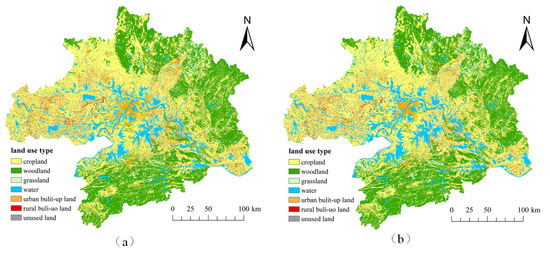 Comparison between the current land use status in 2020 and PLUS simulation. (a) represents the actual land use; (b) represents the land use simulated by PLUS model.