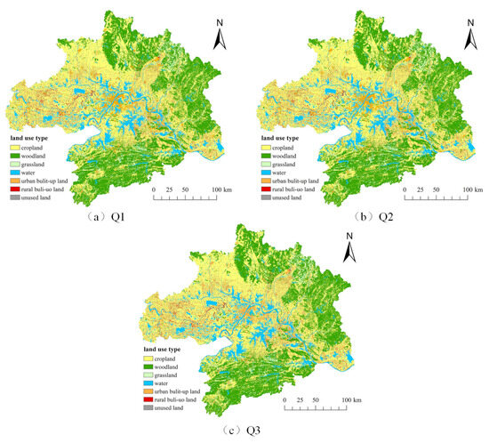 Expansion of Rural Built-up Land Scenario (Q3): The primary purpose of expanding rural built-up land is to support the development of industry and residential space in rural areas based on historical development trends. The Opinions of the CPC Central Committee and the State Council on Comprehensively Promoting Rural Revitalization and Accelerating Agricultural and Rural Modernization clearly propose exploring the implementation of a system for market entry of land for rural collectively operated construction. Therefore, this scenario reduces the probability of rural construction land flow to cropland, forest land, grassland, waters, and urban construction land by 40%, while increasing the probability of cropland, forest land, grassland, waters, and urban construction land flow by 40%.