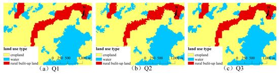 Three potential scenarios for the year 2030 were also simulated (Figure 7 and Table 9). Under Q1, each land category is transformed according to the original transfer probability. Cropland and woodland are projected to increase by 0.153% and 0.188%, respectively. Grassland, water, urban built-up land, and rural built-up land are expected to decrease by 0.013%, 0.146%, 0.195%, and 0.008%, respectively. Rural built-up land will primarily be transferred to cropland, with a total decrease of 437 hectares. Much of this decrease is concentrated in three county-level cities under provincial jurisdiction. This phenomenon may be attributed to local governments’ comprehensive remediation and restoration plans to effectively respond to the hollowing out of rural areas caused by population exodus. As a result, inefficient or abandoned rural built-up land has been substantially converted into cropland. Under Q2, the trend of decreasing total rural built-up land area intensifies, with a total reduction of 5849 hectares. The area of cropland increases significantly, rising by 17,157 hectares. The area of woodland decreases slightly but remains more stable, indicating that ecological land has been protected. Under Q3, the total rural built-up land area increases by 181 hectares. The magnitude of change in cropland is the most prominent among all land changes. This trend indicates that rural built-up land remediation activities have played a key role in optimizing land-use structures and improving food security.