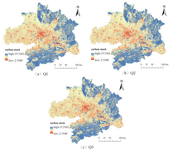 The spatial distribution of carbon in the Wuhan Metropolitan Area in 2030 changes little compared with 2020 under the three different projection scenarios (Figure 9). High values of carbon stocks are clustered in the three densely forested cities: Huanggang, Huangshi, and Xianning. The carbon storage of land resources under Q1 is 6755.94 × 105 tons, which increases by 0.241% compared with 2020. The carbon storage of rural built-up land decreased by 0.196%. Under Q3, the value of carbon storage in land resources is 6753.62 × 105 tons, and the carbon storage in rural construction land rises by 0.081% (Table 10). The growth and loss of carbon storage in land resources show a specific geographical distribution pattern: high values are more dispersed and sporadically distributed on the fringes of the Wuhan Metropolitan Area, forming a hollow pattern with high values surrounding a lower center. Meanwhile, areas of high carbon storage loss are concentrated in the main urban area. Due to urbanization and industrialization pressures, the main urban areas have experienced large-scale land development and utilization changes. The original natural land surface has been replaced by buildings, roads, and other infrastructures, leading to the destruction of ecosystems and the decline of carbon storage capacity. Overall, radiating outward from the main urban area of Wuhan, the carbon stock of land resources has gradually increased, showing a sporadic point-like distribution. The increase is lower in the east and larger in the west, with an overall arrow-shaped distribution, reflecting the gradient change and uneven growth from the city center to the periphery.