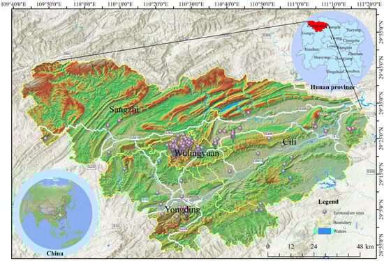 Zhangjiajie, situated in the northwestern part of Hunan Province, China, boasts a unique geographical location with a range of 109°40′–111°20′ E longitude and 28°52′–29°48′ N (Figure 1). The region predominantly features mountainous terrain and is globally acclaimed for its distinctive Zhangjiajie landforms, including the peak sandstone forest landforms. The area experiences a humid subtropical monsoon climate characterized by ample precipitation and simultaneous rain and heat, fostering lush vegetation growth and a diverse range of flora and fauna. Zhangjiajie is home to several rare wildlife species and, as an internationally recognized ecotourism destination, is graced with the distinctions of being a World Geopark, a World Natural Heritage site, and a National Forest Park. The exceptional natural scenery and cultural resources attract a substantial annual influx of domestic and international tourists. In 2023 alone, the city welcomed 36.274 million visitors, generating a total tourism revenue of RMB 51.46 billion, accounting for 83.8% of the region’s gross product.