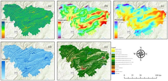 Ecological environment features: (a) NDVI, (b) Temperature, (c) Precipitation, (d) Humidity, (e) Land use.