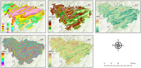Geology and landform features: (a) Geology, (b) Elevation, (c) Slope, (d) Aspect, (e) Relief.