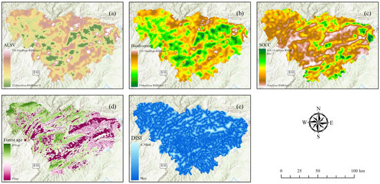 Resource availability features: (a) ALSV, (b) Biodiversity, (c) SOCC, (d) Forest age, (e) DISI.