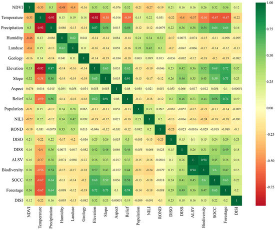 We created a correlation heatmap (Figure 7) to visualize the connection between different geographic features. The correlation between precipitation and elevation was remarkably strong, with a value of 0.87. This indicated that the topography of the Zhangjiajie Mountain Area significantly influences rainfall patterns. In the summer, the southeastern monsoon brings moisture from the Pacific Ocean, leading to topographic rain, which results in abundant water for vegetation growth, promotes biodiversity, and enhances the scenic beauty of the region. The correlation between slope and relief was 0.91, which aligns with the fundamental geographic principles. Biodiversity and ALSV had the highest correlation (0.94), suggesting that areas with rich biodiversity tend to have higher ALSV values.