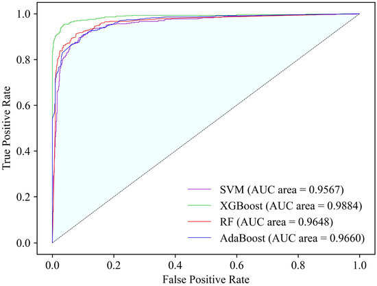 As shown in Table 3, XGBoost exhibited superior performance compared to the remaining three types of models under 10-fold cross-validation. AdaBoost and RF followed in second and third place, respectively. In addition, SVM displayed a notable performance gap compared with the other three model types.