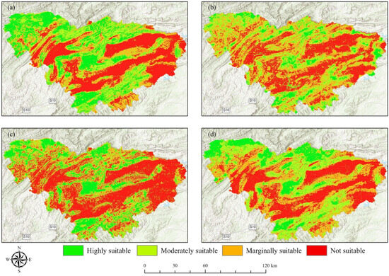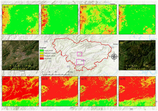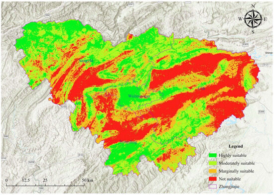Zones with moderate suitability exhibited a distribution pattern similar to that of the highly suitable zones, being primarily concentrated around their periphery. For example, the small mountain range in the southern part of the Wulingyuan urban area, Siduping Township and Tianle Mountain Village in Yongding, Wujiadai and Rhinoceros Villages in the southwestern part of Cili, and Linxiyuan and Niudongkou Villages in the northern part of Sangzhi fell into this category. These areas are located at the interface between human-intensive areas and mountainous regions. They offer both protective functions and development potential, with high vegetation cover and excellent soil and water conservation capacity. They also boast unique flora and fauna, making them well suited for future ecotourism activities. The marginally suitable zones, on the other hand, are primarily located in the transition zone between moderately suitable zones and unsuitable zones. These areas are characterized by high human activity and fragile ecosystems and should, therefore, be protected.