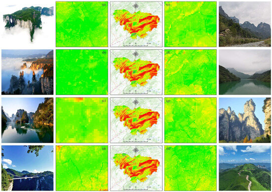 The zones with high suitability were mostly located in the central region of Wulingyuan, southern and southeastern regions of Yongding, northwestern, western, and southwestern regions of Cili, and northern, northwestern, and eastern regions of Sangzhi. These areas were selected to coordinate regional ecotourism resources, including Zhangjiajie National Forest Park, Tianzishan Nature Reserve, Suoxiyu Nature Reserve, and Yangjiajie Nature Reserve. In the southern part of Yongding (south of the urban area of Zhangjiajie), several patches of highly suitable areas were separated from the core urban area. This is related to two factors, first of which is the presence of Tianmen Mountain National Forest Park (Figure 13a), which features a combination of a natural landscape, biological resources, and humanistic history and is rich in ecotourism resources. Second, this area is a transitional zone between the basin topography of the urban area of Zhangjiajie and the southern Tianmen Mountain, resulting in different levels of suitability with clear boundaries. The highly suitable zones of Cili are concentrated primarily in the northwestern (Figure 13h), western, and southwestern regions, which feature mountainous terrain, high vegetation cover, and strong soil and water conservation capacity, coupled with a unique topography and outstanding aesthetic landscape value. In Sangzhi, the distribution patterns of highly suitable zones were similar.