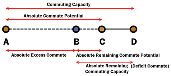 Therefore, conceptually, the commuting spectrum in a region ranges between the required commute (lower bound A) and the (rectified upper bound C), as well as the theoretical maximum average commute (absolute upper bound D), with the actual (observed or estimated) commute (B) falling somewhere between A and D (See Figure 1). The difference between the actual commute and either of the two bounds (that is, segment lines AB and BC, or segment lines AB and BD), i.e., the absolute excess commute and the absolute remaining commute potential or the absolute remaining commuting capacity, respectively, and the total range (segment line AC or AD), i.e., the absolute commute potential and the commuting capacity, respectively, could be regarded as indicators of a region’s commuting efficiency. To complement the urban commuting landscape, Niedzielski [20] coined the notion of “deficit commuting,” which accounts for the unused portion of the commuting capacity, represented by the BC or BD segment in the conceptual spectrum shown in Figure 1. This statistic could prove valuable from an end-of-trip perspective, as it delineates the trade-off between commuting efficiency and an employer’s attractiveness to the workforce, as well as the level of agglomeration economy within a region.