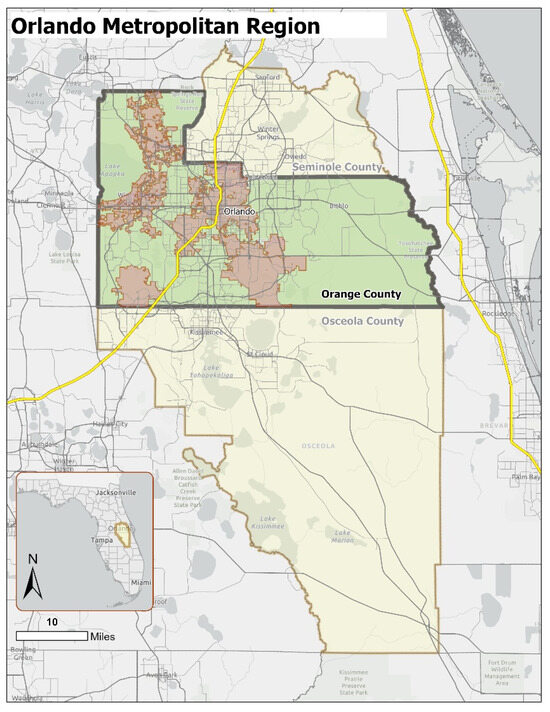 Orange County, one of the three counties comprising the Orlando Metropolitan Region, has been chosen as the study area for this research (see Figure 2). With a population of roughly 1.2 million and a job-worker ratio of 1.4 in the year 2020, Orange County is Central Florida’s most populous county, as well as its major employment hub. Regionally, Orange County has reported the highest levels of auto congestion, with over 85% of all daily trips made by automobile.