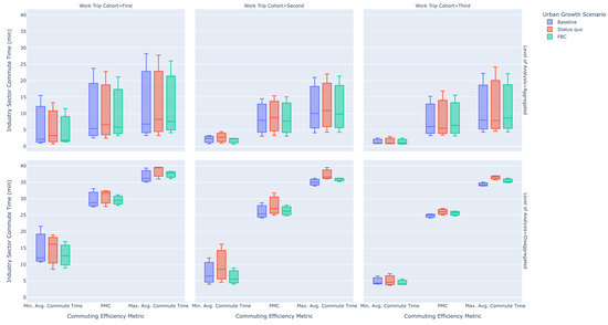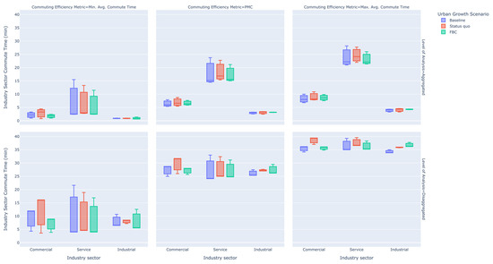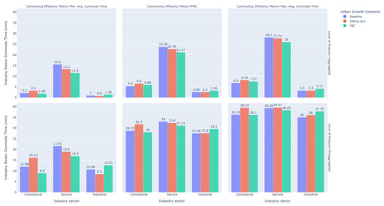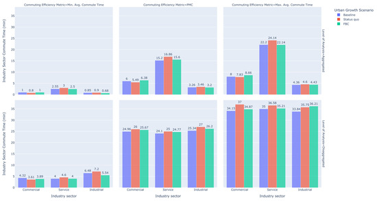 Disaggregated commuting efficiency metrics delineated across three categories of journey-to-work trips, segmented along industry sectors, across three development scenarios (metrics are measured in minutes).