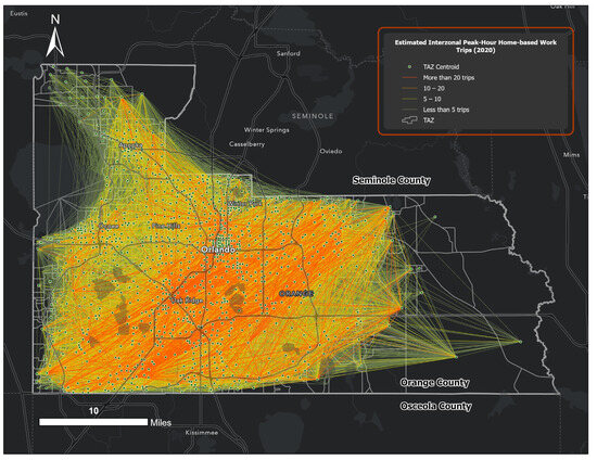 On average, an employee in Orange County experiences a longer commute time of 28.8 min compared to the typical U.S. worker’s commute of 26.9 min. Regional models project rapid economic growth in Central Florida over the next 25 years. Orange County is expected to witness population and employment growth rates of 63% and 68%, respectively, by 2045. Accordingly, the County’s travel demand metrics, such as person trips, VMT, and VHT, are expected to increase by 73%, 62%, and 81%, respectively [53]. Urban challenges related to congestion and commuting are likely to worsen in the future as the region experiences rapid population growth, particularly with the expansion of the tourism and hospitality industry. Moreover, Orange County is in the process of employing a form-based code as part of the reorganization of the County’s Comprehensive Plan (Vision 2050), as well as the associated land development code (Orange Code). All these factors make Orange County an appropriate case study for analyzing the potential effects of the FBC on commuting patterns.