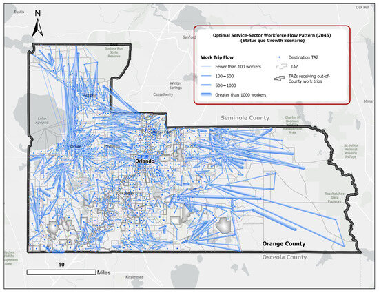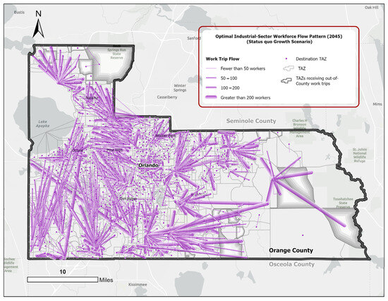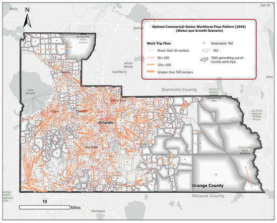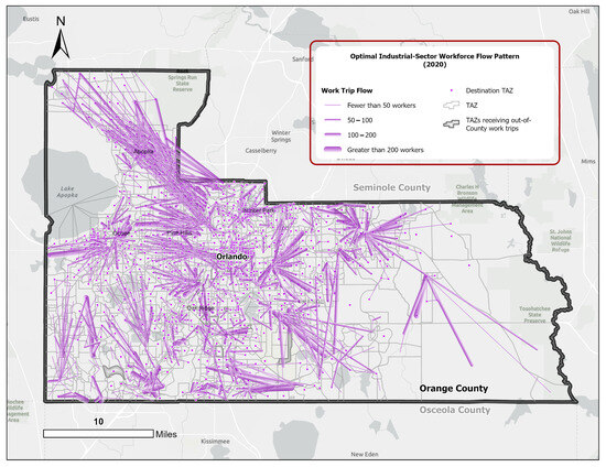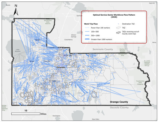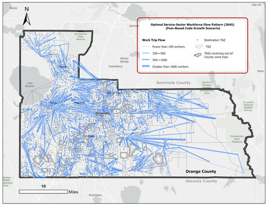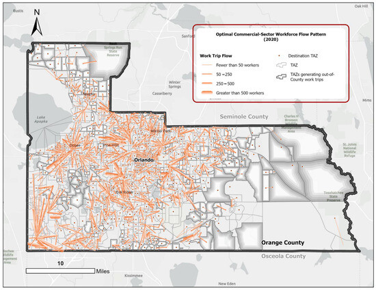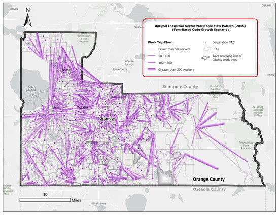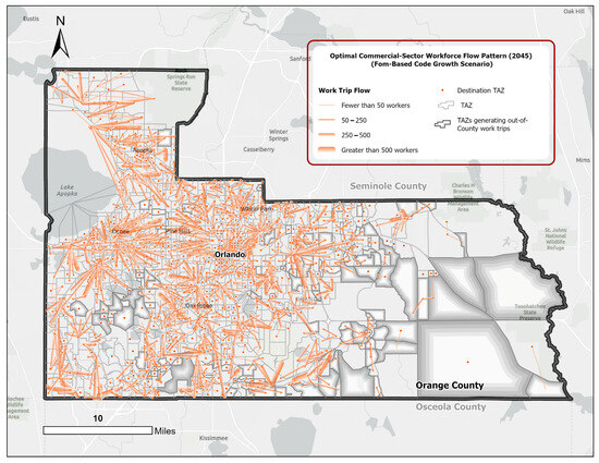 To fill these gaps, this empirical study integrates GIS and spatial analytics with linear programming to measure the efficacy of a reformed city planning framework, known as the form-based code (FBC). This is assessed in terms of commuting efficiency metrics, manifested through the spatial dynamics between the locations of residences and workplaces at different spatial scales. A disaggregated variant of the classic transportation problem (CTP) is structured to model the optimal commuting flows of three major workforce groups across three urban growth scenarios. Using the zonal data (ZDATA) for the Orlando metropolitan region in Central Florida, this study measures aggregated and disaggregated commuting efficiency metrics in Orange County—the region’s major employment and population center—within the present and future development frameworks.
