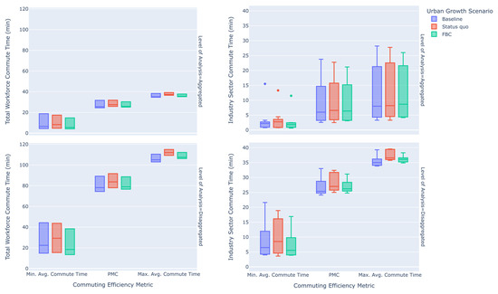 Distribution of basic commuting efficiency metrics inclusive of all work trip cohorts, categorized by industry sector, level of analysis, and urban growth scenario.