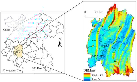 Geographical location and administrative division map of the central urban area. Note: YZ—Yuzhong; YB—Yubei; JB—Jiangbei; SPB—Shapingba; NA—Nanan; BB—Beibei; JLP—Jiulongpo; DDK—Dadukou; BN—Banan.