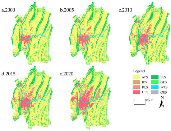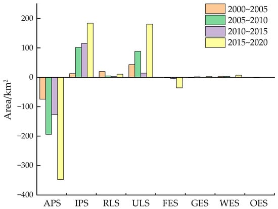 Changes in EPLS in the central urban area. Note: APS—Agricultural production space; IPS—Industrial and mining production space; RLS—Rural living space; ULS—Urban living space; FES—Forest ecological space; GES—Grassland ecological space; WES—Water ecological space; OES—Other ecological spaces.