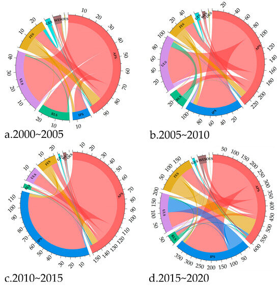 From 2000 to 2020, the EPLS witnessed transformative land use shifts driven by socio-economic strategies, significantly altering the regional landscape (Figure 4). A total reduction of 743.38 km2 in agricultural spaces highlights the overarching shift towards industrial and urban development. This transition is quantitatively significant, with agricultural land repurposed predominantly for industrial and mining production spaces (475.53 km2) and urban living spaces (222.53 km2).
