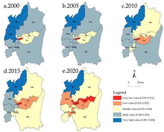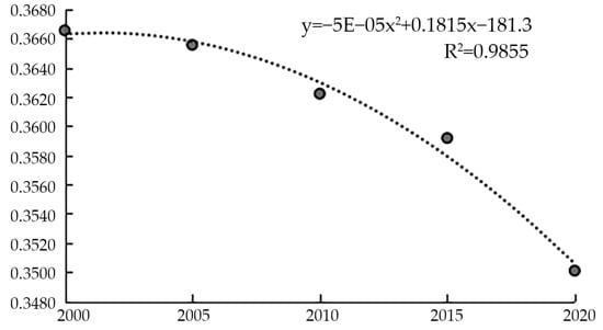 Over the past two decades, the index has exhibited a parabolic decline, decreasing from 0.3665 in 2000 to 0.3501 in 2020 (Figure 5). While there has been an overall deterioration in quality, the magnitude is relatively small. This is because the changes in the eco-environment in the central urban area have simultaneously involved both environmental optimization and degradation, resulting in a certain degree of offsetting.