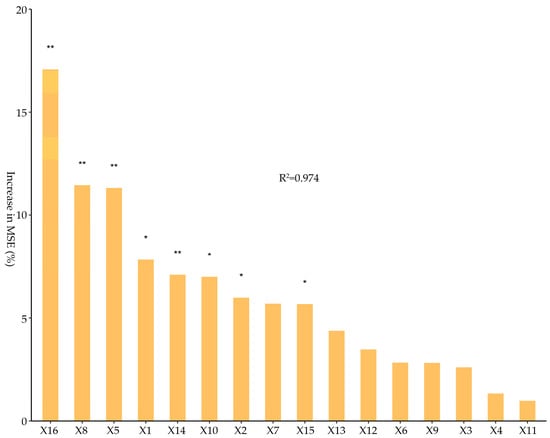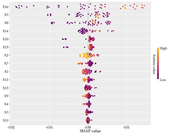 Eight influencing variables significantly affect regional EQI changes. Among them, Pesticide usage (X16), grain production (X8), and added value of the primary industry (X5) collectively contribute 17.08%, 11.45%, and 11.32%, respectively. Specifically, among all variables with significant effects, X16 ranks first, and is significantly higher than other variables (Figure 7 and Figure 8). Furthermore, its higher value has a notably positive effect on regional EQI changes. Secondly, X8 and X5, representing technological level and industrial structure, respectively, have the second- and third-highest relative importance. Both are generally positively correlated with the EQI. Thirdly, permanent population (X1: 7.84%), public library collections (X14: 7.10%), and road mileage (X10: 7%) have relatively moderate explanatory power with similar magnitudes. However, X1 mostly exhibits a negative correlation with EQI changes, while X14 and X10 generally show positive correlations. Finally, urbanization rate (X2) and CO2 emissions (X15) have weaker explanatory power at 5.99% and 5.67%, respectively. Interestingly, although X15 has a low impact on EQI changes, it also exhibits a positive correlation.
