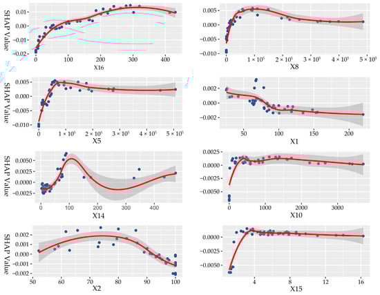 As is shown in Figure 9, the relationship between X16 and the regional EQI shows a negative to positive correlation trend. As the feature value increases, the positive correlation strengthens until it reaches a threshold of 300, after which the positive correlation weakens. The X8, X5, X10, and X15 variables exhibit a common pattern. Initially, there is a negative correlation with regional EQI. As the feature values increase, the correlation shifts to a pronounced positive trend. Beyond a certain threshold, the positive correlation diminishes and approaches zero, indicating that the impact of these factors becomes very limited once they reach an ideal state. The relationship between X1 and the regional EQI shows a clear monotonic decrease, indicating a significant negative correlation. X14 shows substantial variability in its relationship with the regional EQI, characterized by noticeable peaks and troughs. The quality initially increases sharply within the range of 0 to 100. However, between 100 and 250, there is a significant decrease, followed by another increase as the feature value rises. The relationship between X2 and the regional EQI is relatively clear. When X2 is between 52 and 75, the positive correlation strengthens with increasing feature values. However, once X2 exceeds 75, the correlation turns negative with further increases in the feature value.