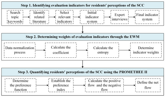 A novel evaluation method was established using EWM and PROMETHEE II approaches to quantify residents’ perceptions of the SCC. The evaluation process is shown in Figure 1. Specifically, Step 1 is to identify the evaluation indicators for residents’ perceptions of the SCC using the literature review (LR) and expert interviews. Step 2 is to determine the evaluation indicator weights through EWM. Step 3 is to quantify residents’ perceptions of the SCC using PROMETHEE II.