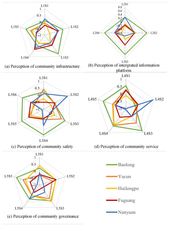 As shown in Figure 5, the results were displayed using a radar chart to enhance readability, illustrating the residents’ perceptions of the SCC across 25 evaluation indicators in the five communities. The radar chart provided an intuitive method for identifying the evaluation indicators where these communities need improvement. The results indicated that while these communities demonstrated excellence in specific dimensions, they still require further improvement in others. Specifically, the Baolong community excelled in most indicators across all five dimensions but ranked lowest in the perception of property services. In contrast, while performing the worst overall, the Nanyuan community ranked first in the perception of property services, response to public safety events, infrastructure planning, and the visualization platform. This ranking suggests that residents in this community perceive strong effectiveness in the SCC within these aspects.