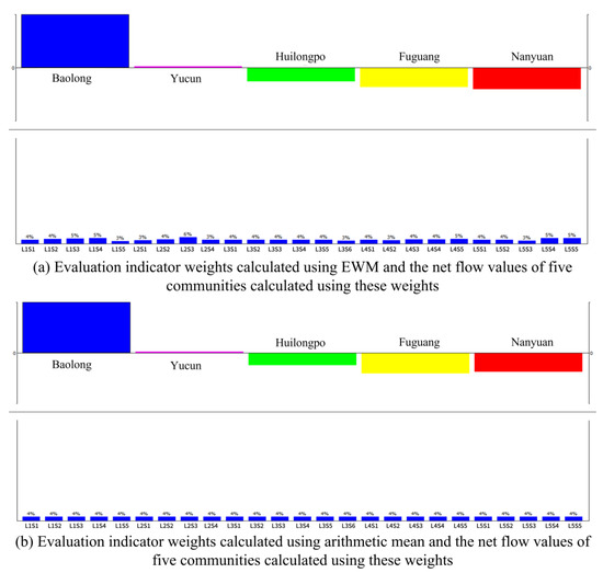 After obtaining the weights for the 25 evaluation indicators, the PROMETHEE II method, combined with the questionnaire data from 410 respondents, can be used to quantify the residents’ perceptions of the SCC across five communities. Specifically, the study utilized Equations (8)–(12) to calculate the net flow for the five communities and ranked them as presented in Table 4. The net flow values varied from −0.1749 to 0.4335, with higher values reflecting more favorable levels of residents’ perceptions of the SCC. Consequently, the Baolong community exhibited the highest level of residents’ perceptions of the SCC with a value of 0.4335, followed by the Yucun community (0.0111), Huilongpo community (−0.1126), and Fuguang community (−0.1571). Conversely, the Nanyuan community displayed the lowest level of residents’ perceptions of the SCC at −0.1749.