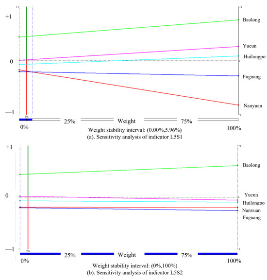 Moreover, the Visual PROMETHEE software incorporates Visual Stability Interval functions, which facilitate monitoring stability intervals for individual indicators, ensuring consistent evaluation outcomes. This tool allows for precise adjustments to the weights of specific indicators, quantifying their impact on the overall ranking. Such analysis significantly improves the understanding of weight sensitivity and the reliability of decision outcomes. For instance, as shown in Figure 7, the weight of indicator L3S1 ranges from 0% to 6.36% without affecting the overall ranking. However, weights exceeding 6.36% alter the ranking, indicating a critical threshold for stability. In contrast, the weight of indicator L3S3, with a stability interval from 0% to 100%, shows no impact on the ranking, suggesting robustness against weight variations. Therefore, broader stability intervals generally indicate lower sensitivity of the rankings to changes in the weights of indicators. Extensive analysis of 25 indicators revealed that variations in the weights of indicators L4S4 and L5S5 did not influence the evaluation outcomes, highlighting their stability within the tested scenarios.