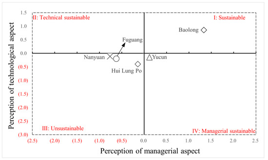 This study conducted an in-depth analysis of the evaluation results to enhance residents’ perceptions of the SCC. Previous research has identified two distinct dimensions of residents’ perceptions relevant to the SCC: the perception of the managerial aspect and the perception of the technological aspect [29]. Generally, the perception of the managerial aspect emphasizes community safety, community service, and community governance [44,47], while the perception of the technological aspect focuses on fostering smart infrastructure and addressing socio-technical challenges [48,49]. Therefore, the dimensions of community safety, community service, and community governance were classified as the perception of managerial aspects, while community infrastructure and integrated services platforms were classified as the perception of technological aspects. Following this, the five communities in each category were compiled to create a decision matrix, as shown in Figure 8.