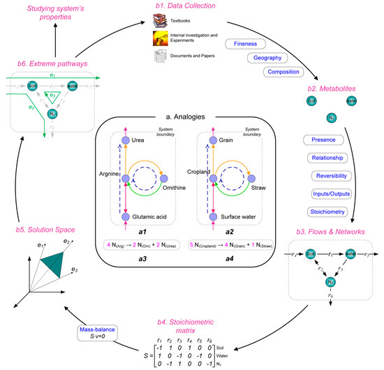 Figure 1a): (i) networks: both systems demand a complex network to represent the global relationships of matter flows; (ii) pathways: both networks can be decomposed into a series of pathways, which represent a specially functional subset; (iii) conversions: a pathway in both systems consists of a group of connected conversions, including transportation and chemical reactions, and can be described by stoichiometric equations; and (iv) constraints: both systems are limited by different constraints, where the two fundamental types are balance (the conservation of mass) and bounds (constraining the values of individual variables, e.g., the flux range of a conversion or pathway). In fact, ecological theory might benefit from the use of analogies among multi-scale biosystems to accelerate the development of new concepts (e.g., ‘urban metabolism’) and apply it to coupled human and natural systems [