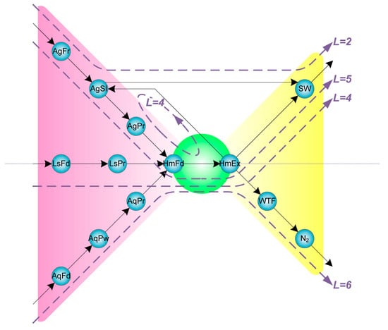 Based on the subsystems, there are four types of metabolites: (A) those for processors and consumers, except for the forest–grassland subsystem, and those metabolites that were the inner components of subsystems. (B) All removers, life supporters, and forest–grassland subsystems were treated as a single metabolite. (C) Additional metabolites were considered to construct a complete network, including the outer atmosphere (the source of wet deposition), N2 (we divided it into two metabolites: N2In for the source of biological fixation and N2Ot for the target of denitrification), and accumulation (an abstract metabolite for maintaining mass balance). (D) Five external metabolites were added to the system to simplify the expression of conversions and the representation of inputs/outputs. External metabolites do not change the structural properties of the network, and we did not consider them when calculating the pathway length. The naming rule of a metabolite is as follows: for types A and D, the name of a metabolite (four letters) is the combination of its subsystem name (two letters in the abbreviation) and its component name (two letters in the abbreviation); for types B and C, the name of a metabolite just is the name of the abbreviation of the corresponding subsystem name (to 2–4 letters).