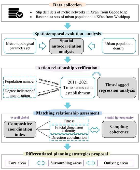 In rapid urbanization, urban areas have absorbed numerous people, bringing unprecedented vitality and development prospects. Nevertheless, it also produced a series of urban diseases, such as population congestion and environmental pollution, and cities face enormous commuting pressures. Therefore, low-carbon public transport, represented by rail transit, has shown explosive growth with high efficiency and convenience. The large-scale development of rail transit has a massive thrust on population distribution [1,2]. The spatial relationship and influence mechanism between the metro networks and the population profoundly impact the supply and demand of rail transit. This further determines the utilization efficiency of the urban metro networks. Due to the lack of in-depth preliminary demonstration targeting the spatiotemporal evolution analysis of their matching relationship, the explosive expansion of urban metro has led to an unbalanced distribution of transport capacity supply. Therefore, the practical problem of wasting infrastructure resources emerged. The pre-planning of urban interior layout is critical for alleviating the above phenomenon, so the matching relationship between the metro networks and the urban population needs to be clarified first [3].
