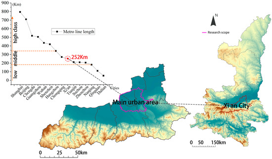 Based on the spatial characteristics of most metropolitan areas worldwide, most urban regions are located in the plains or shallow hilly areas [35]. As shown in the broken-line graphs of Figure 2, compared with the super-developed cities such as Shanghai and Beijing, the construction intensity of the metro networks in Xi’an City was relatively slow in middle-class areas. As a leading city in Northwest China, Xi’an is still in a period of high-speed development of metro construction and population movement in the future. Improving the rationality of spatial planning decisions is essential for cities’ high quality and intelligent growth. In addition, other cities in the middle class still face major metro construction tasks, like Zhenzhou and Suzhou cities. Moreover, the opening year of the first metro route in the above cities was around 2011, and the population size of the cities was comparable, so the metro–population interaction vein was close. Therefore, the representative city of Xi’an was selected for empirical evidence. As the six districts cover most of the metro stations, it was selected as the research scope with complete urban construction. Specifically, it includes Xincheng, Beilin, Lianhu, Yanta, Baqiao, and Weiyang districts, generally called the main urban area, with a total land area of 125 km2.