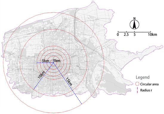 As shown in Figure 4, the metro middle with the highest degree was selected as the center point for the comprehensive measurement, and the area was divided into zones with a measurement radius of 1, 2, 3, 4, 5, 10, and 15 km.