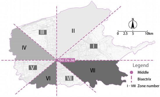 The degree of coordination between urban metro and population distribution in azimuth includes norm and direction similarity [46]. As shown in Figure 5, taking the metro middle as the central point, the area was divided into eight fan-shaped regions according to the orientation.